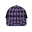 Top off your look with the stylish and functional Black And Purple Argyle Pattern Print Black Mesh Trucker Hat. This trucker hat combines timeless design with practical features, making it a must-have accessory for outdoor adventures, casual outings, and athletic activities. Whether you're looking for sun protection or a trendy way to complete your outfit, this hat has you covered.