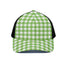 Top off your look with the stylish and functional Pear Green And White Gingham Print Black Mesh Trucker Hat. This trucker hat combines timeless design with practical features, making it a must-have accessory for outdoor adventures, casual outings, and athletic activities. Whether you're looking for sun protection or a trendy way to complete your outfit, this hat has you covered.