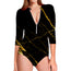 Are you looking for unique swimsuits? Check our Black Gold Scratch Marble Print Long Sleeve Swimsuit on GearFrost. Our swimsuits are handcrafted to the highest quality standards and made-to-order for you!