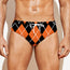 Are you looking for unique men's swim briefs? Check our Orange And Black Argyle Print Men's Swim Briefs on GearFrost. Our swim briefs are handcrafted to the highest quality standards and made-to-order for you!