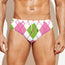 Are you looking for unique men's swim briefs? Check our Pink Green And White Argyle Print Men's Swim Briefs on GearFrost. Our swim briefs are handcrafted to the highest quality standards and made-to-order for you!