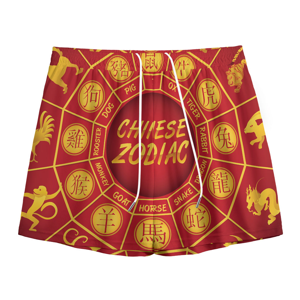 Red And Yellow Chinese Zodiac Print Mesh Shorts