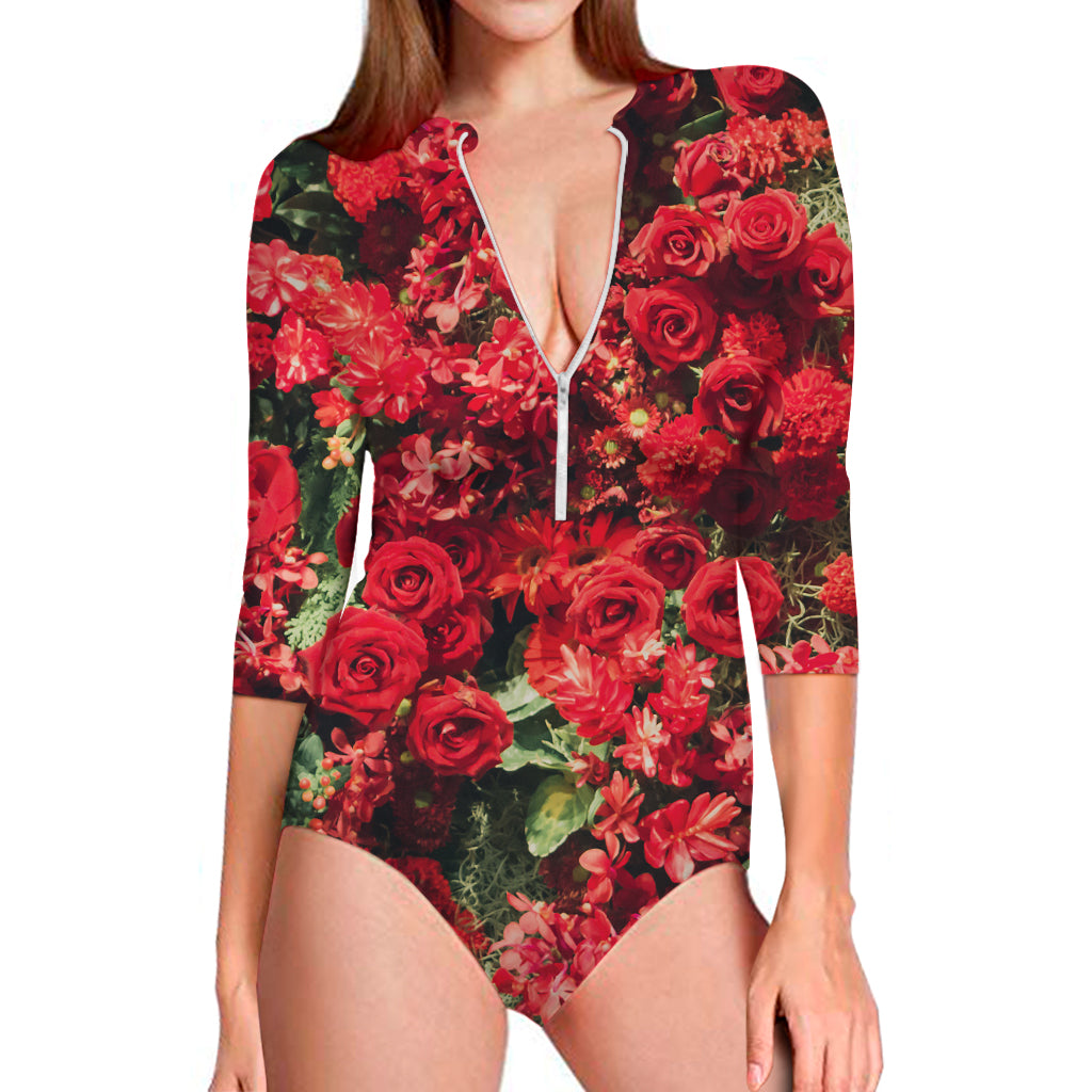 Red Rose Flower Camouflage Print High Cut One Piece Swimsuit