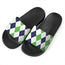 Are you looking for unique slides? Check our Green White And Navy Argyle Print Black Slide Sandals on GearFrost. Our slides are handcrafted to the highest quality standards and made-to-order for you!