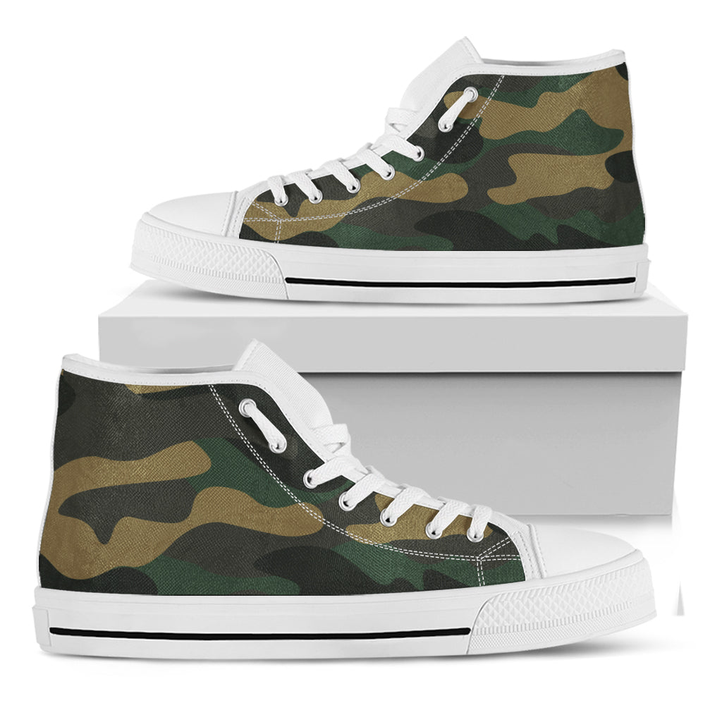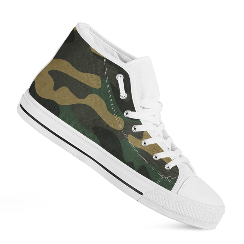 Are you looking for unique sneakers? Check our Black And Green Camouflage Print White High Top Sneakers on GearFrost. Our sneakers are handcrafted to the highest quality standards and made-to-order for you!