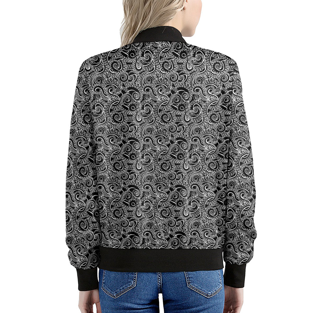 Make a bold statement with the sleek and stylish Black And White Octopus Tentacles Print Women's Bomber Jacket. This women's bomber jacket combines a classic silhouette with modern design, offering the perfect mix of fashion and functionality. Whether you're layering it for a chilly day or adding a finishing touch to your outfit, this jacket is designed to keep you comfortable while elevating your style.