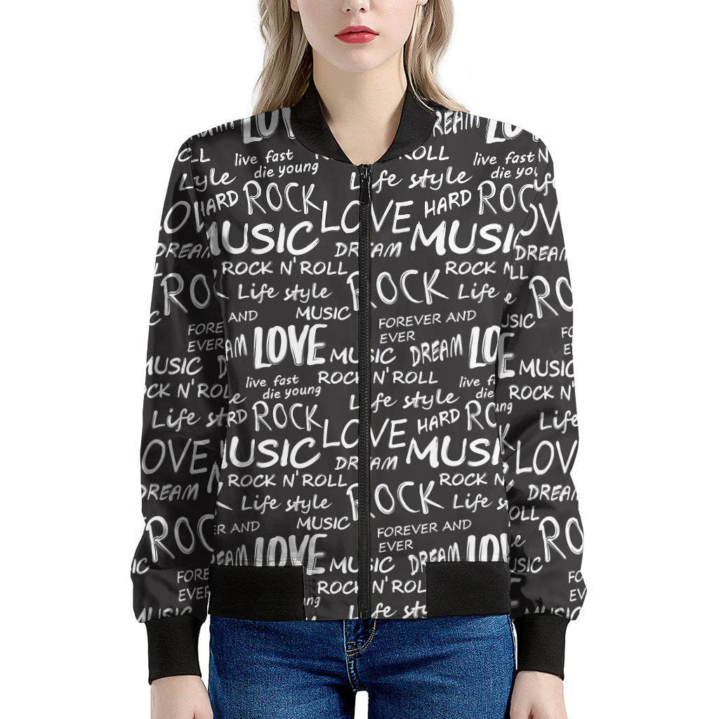 Make a bold statement with the sleek and stylish Black And White Rock And Roll Print Women's Bomber Jacket. This women's bomber jacket combines a classic silhouette with modern design, offering the perfect mix of fashion and functionality. Whether you're layering it for a chilly day or adding a finishing touch to your outfit, this jacket is designed to keep you comfortable while elevating your style.