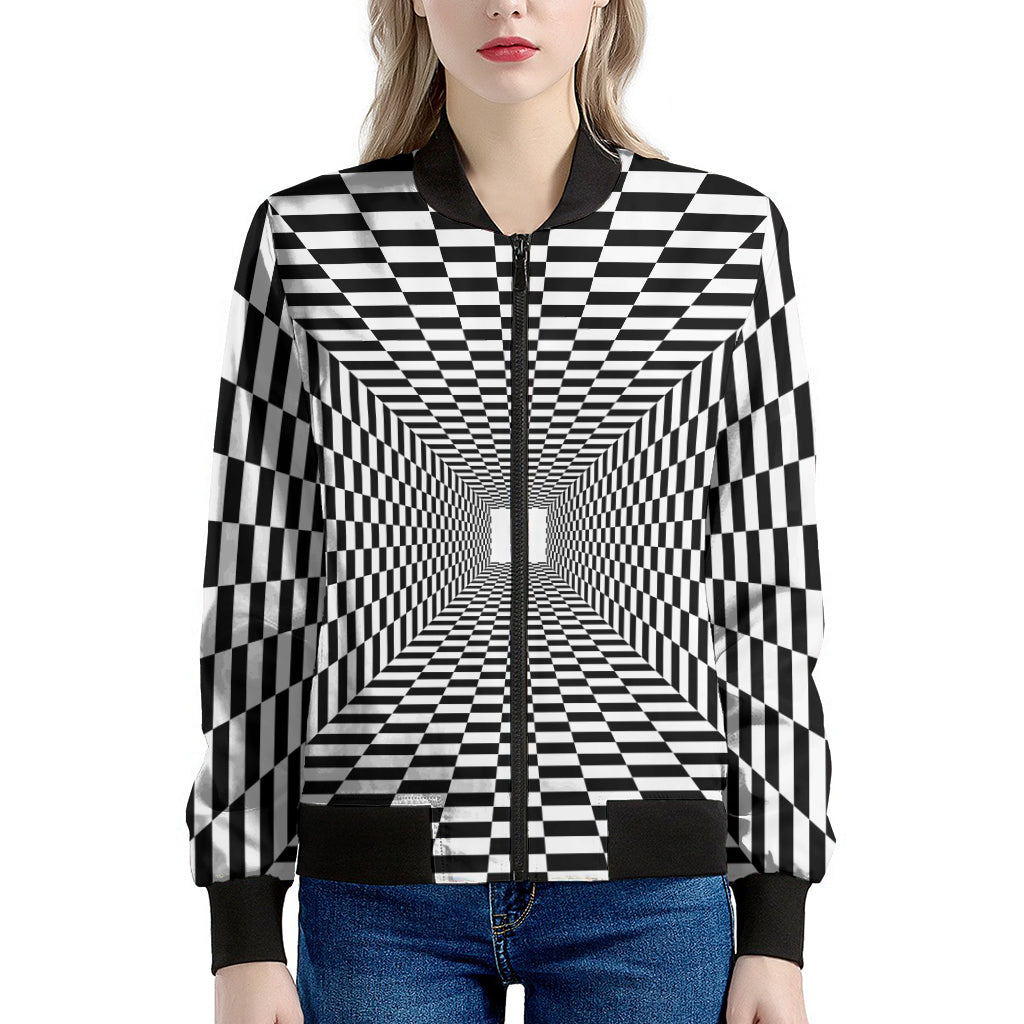 Make a bold statement with the sleek and stylish Black And White Tunnel Illusion Print Women's Bomber Jacket. This women's bomber jacket combines a classic silhouette with modern design, offering the perfect mix of fashion and functionality. Whether you're layering it for a chilly day or adding a finishing touch to your outfit, this jacket is designed to keep you comfortable while elevating your style.
