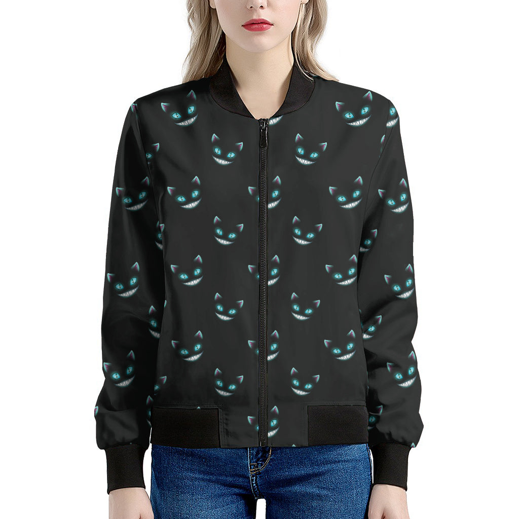 Make a bold statement with the sleek and stylish Black Cheshire Cat Pattern Print Women's Bomber Jacket. This women's bomber jacket combines a classic silhouette with modern design, offering the perfect mix of fashion and functionality. Whether you're layering it for a chilly day or adding a finishing touch to your outfit, this jacket is designed to keep you comfortable while elevating your style.