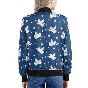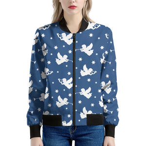 Make a bold statement with the sleek and stylish Blue And White Angel Pattern Print Women's Bomber Jacket. This women's bomber jacket combines a classic silhouette with modern design, offering the perfect mix of fashion and functionality. Whether you're layering it for a chilly day or adding a finishing touch to your outfit, this jacket is designed to keep you comfortable while elevating your style.