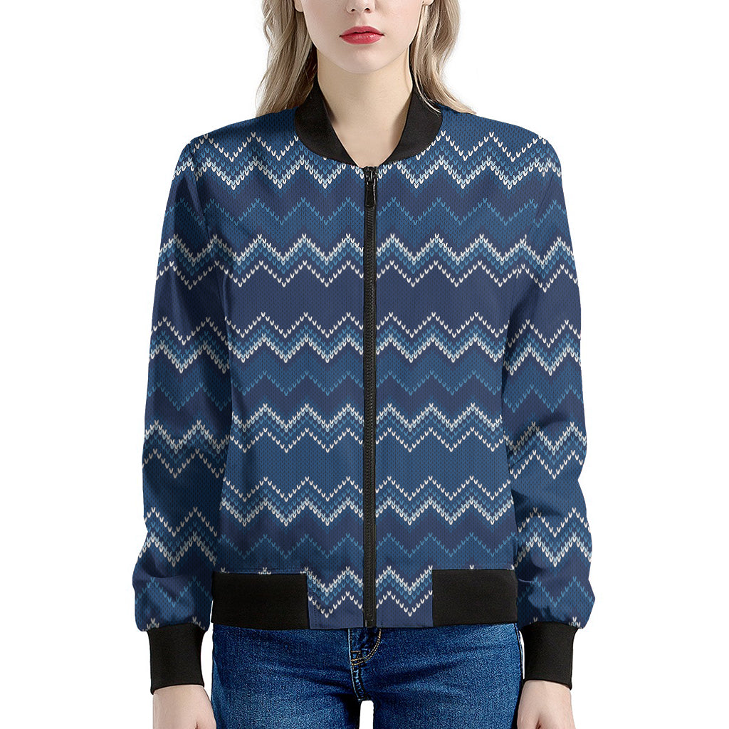 Make a bold statement with the sleek and stylish Blue Chevron Knitted Pattern Print Women's Bomber Jacket. This women's bomber jacket combines a classic silhouette with modern design, offering the perfect mix of fashion and functionality. Whether you're layering it for a chilly day or adding a finishing touch to your outfit, this jacket is designed to keep you comfortable while elevating your style.