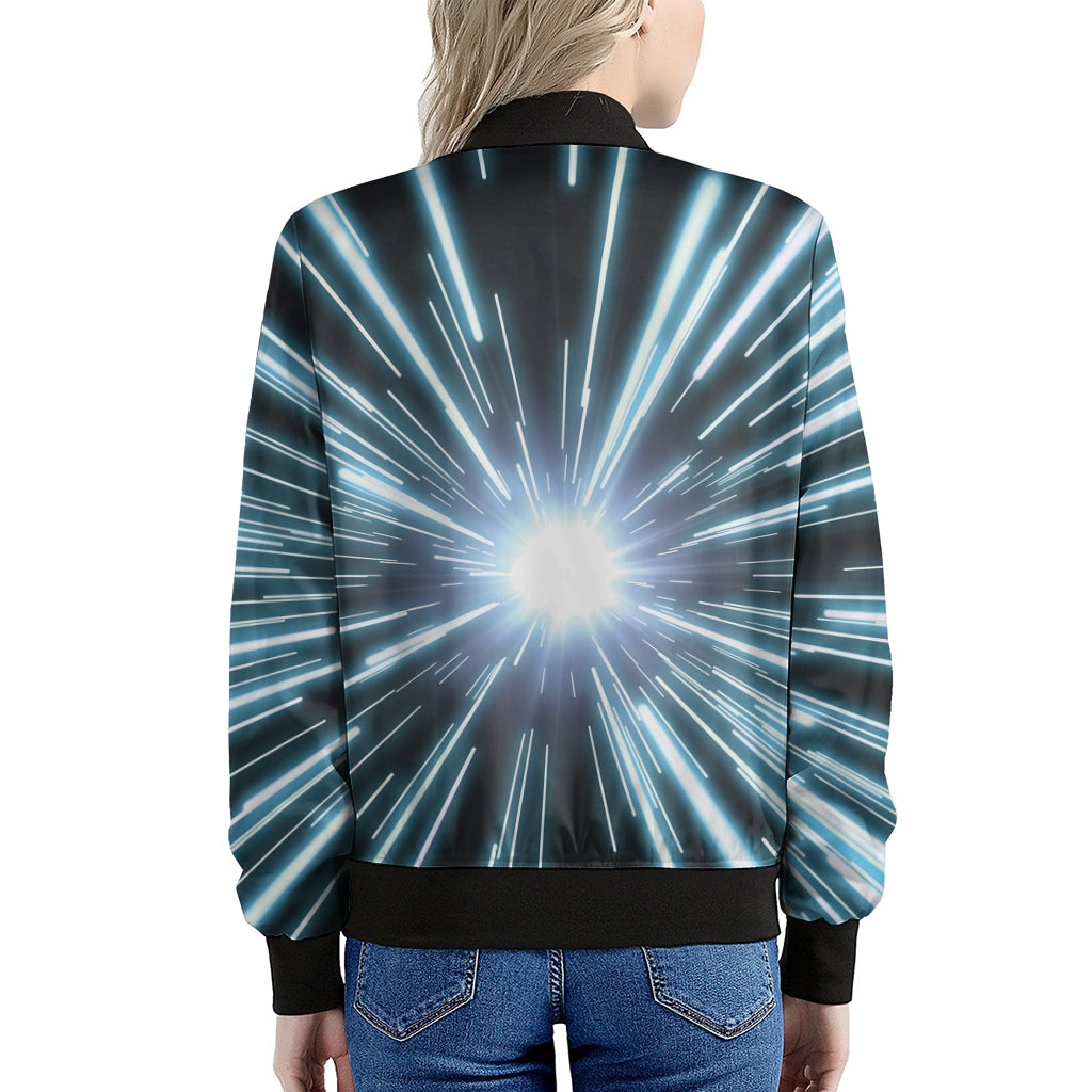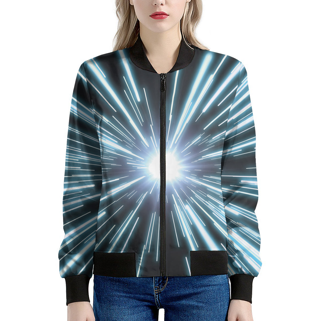 Make a bold statement with the sleek and stylish Blue Lightspeed Print Women's Bomber Jacket. This women's bomber jacket combines a classic silhouette with modern design, offering the perfect mix of fashion and functionality. Whether you're layering it for a chilly day or adding a finishing touch to your outfit, this jacket is designed to keep you comfortable while elevating your style.