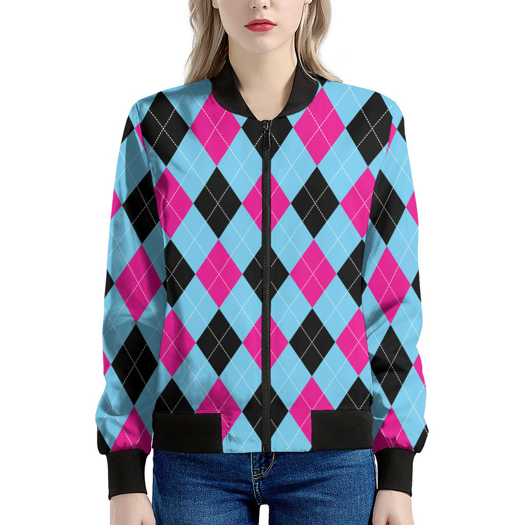 Make a bold statement with the sleek and stylish Blue Pink And Black Argyle Pattern Print Women's Bomber Jacket. This women's bomber jacket combines a classic silhouette with modern design, offering the perfect mix of fashion and functionality. Whether you're layering it for a chilly day or adding a finishing touch to your outfit, this jacket is designed to keep you comfortable while elevating your style.