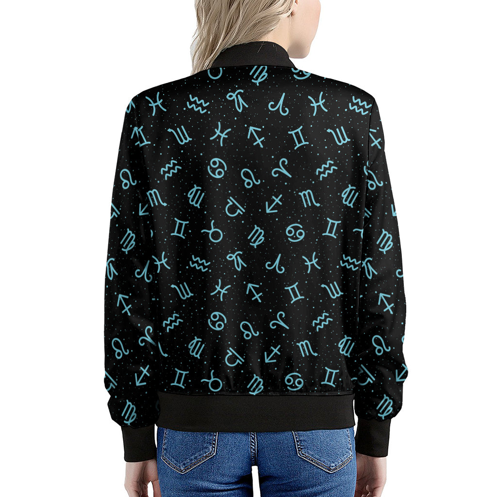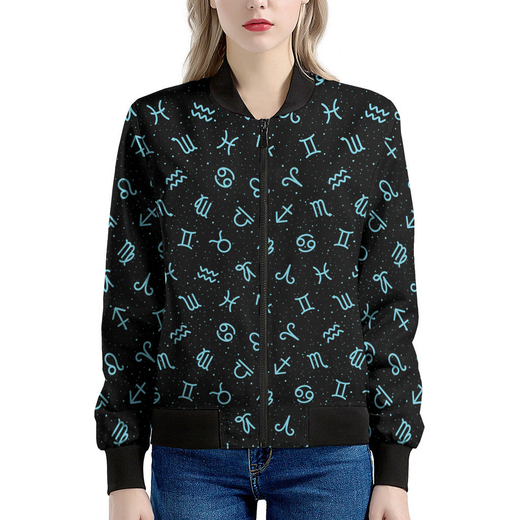 Make a bold statement with the sleek and stylish Blue Zodiac Symbols Pattern Print Women's Bomber Jacket. This women's bomber jacket combines a classic silhouette with modern design, offering the perfect mix of fashion and functionality. Whether you're layering it for a chilly day or adding a finishing touch to your outfit, this jacket is designed to keep you comfortable while elevating your style.