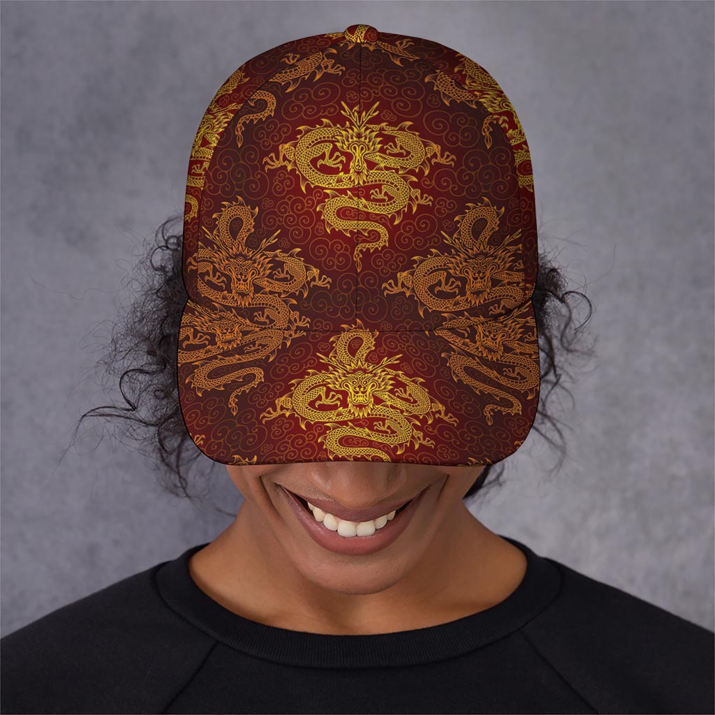 Top off your look with the stylish and functional Gold Chinese Dragon Pattern Print Baseball Cap. Designed for comfort and durability, this baseball cap is the perfect accessory for casual outings, outdoor activities, or simply elevating your everyday style. Its sleek design and practical features make it a wardrobe essential for anyone who values both form and function.