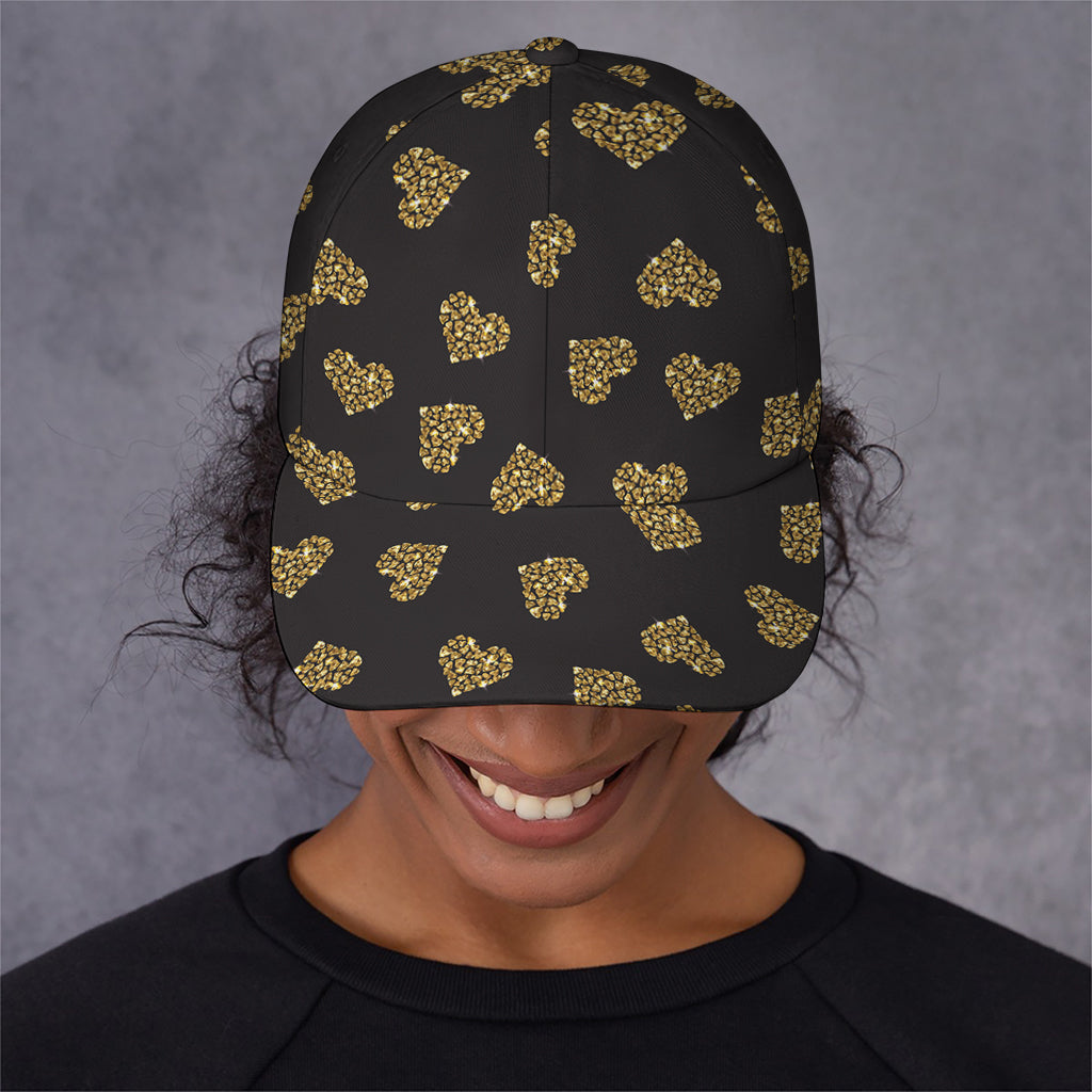 Top off your look with the stylish and functional Gold Heart (NOT Real) Glitter Print Baseball Cap. Designed for comfort and durability, this baseball cap is the perfect accessory for casual outings, outdoor activities, or simply elevating your everyday style. Its sleek design and practical features make it a wardrobe essential for anyone who values both form and function.