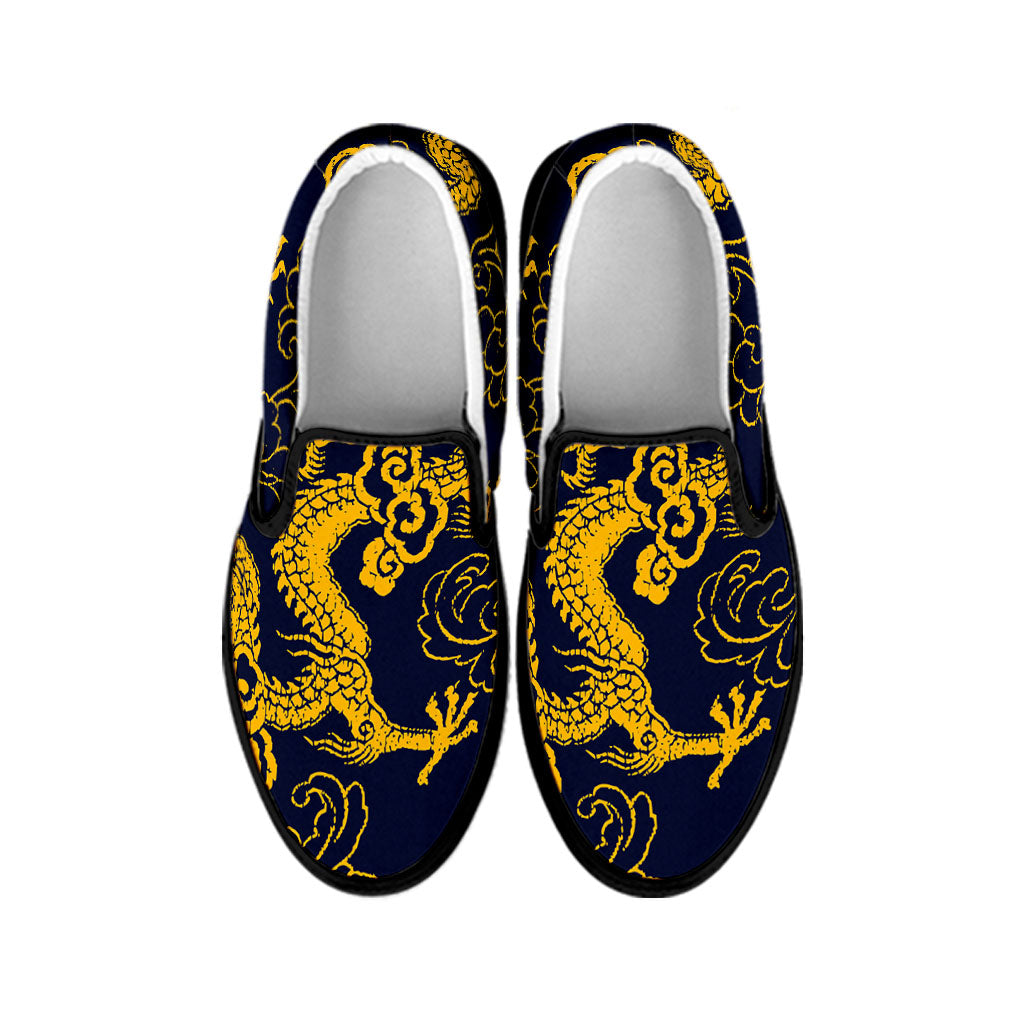Are you looking for unique sneakers? Check our Gold Japanese Dragon Pattern Print Black Slip On Sneakers on GearFrost. Our sneakers are handcrafted to the highest quality standards and made-to-order for you!