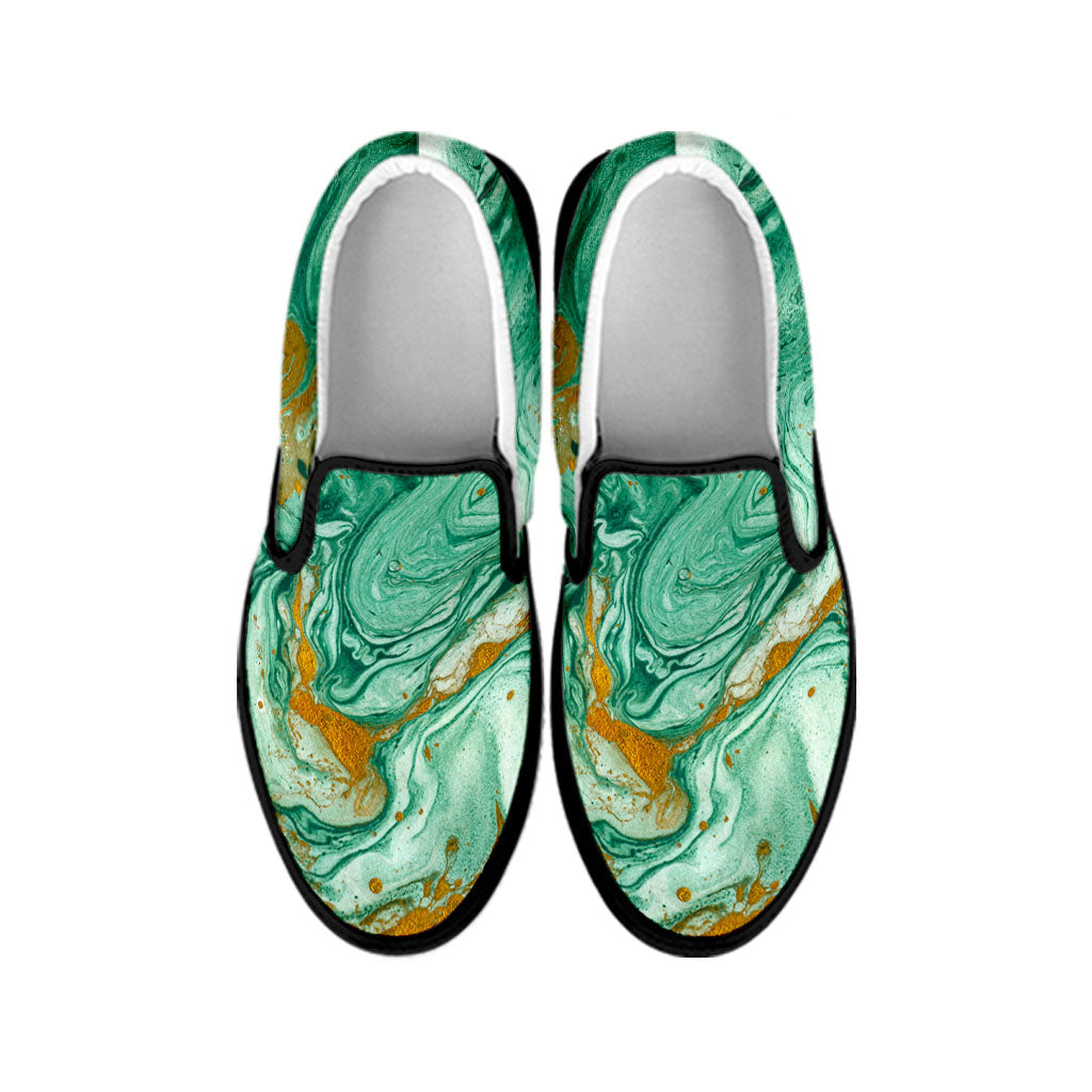 Are you looking for unique sneakers? Check our Green Gold Liquid Marble Print Black Slip On Sneakers on GearFrost. Our sneakers are handcrafted to the highest quality standards and made-to-order for you!