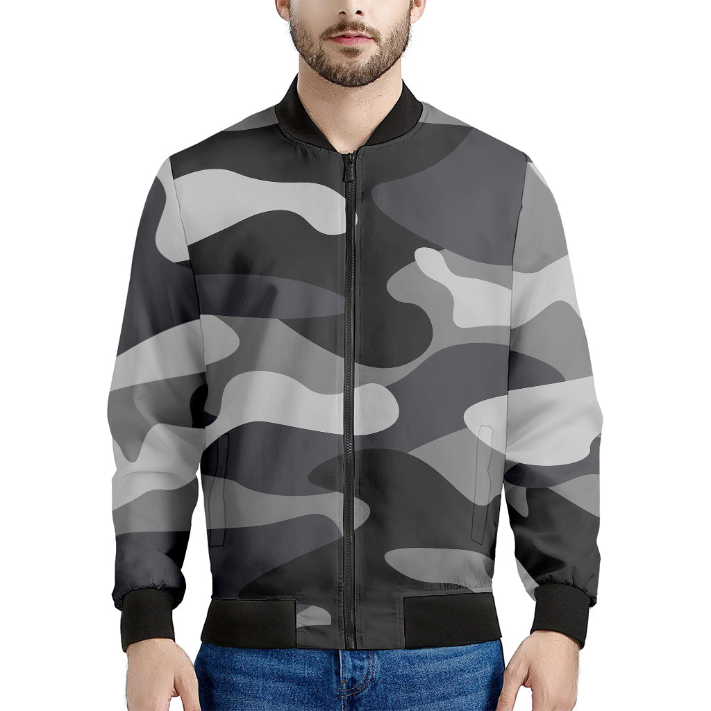 Are you looking for unique bomber jackets? Check our Grey And White Camouflage Print Men's Bomber Jacket on GearFrost. Our bomber jackets are handcrafted to the highest quality standards and made-to-order for you!