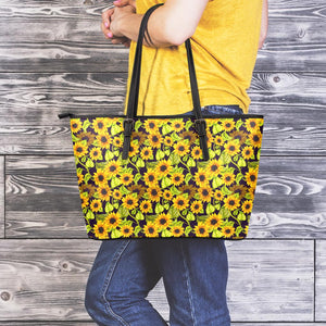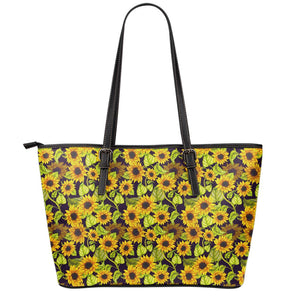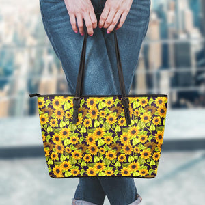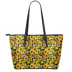 Black Sunflower Pattern Print Leather Tote Bag With Zipper