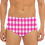 Stay confident at the pool or beach with the Hot Pink And White Buffalo Check Print Men's Triangle Swim Briefs. Designed with a blend of 88% polyester and 12% spandex, these swim briefs provide comfort, stretch, and support for everyday swimwear use. The smooth fabric and regular fit make them practical for both swimming and lounging.