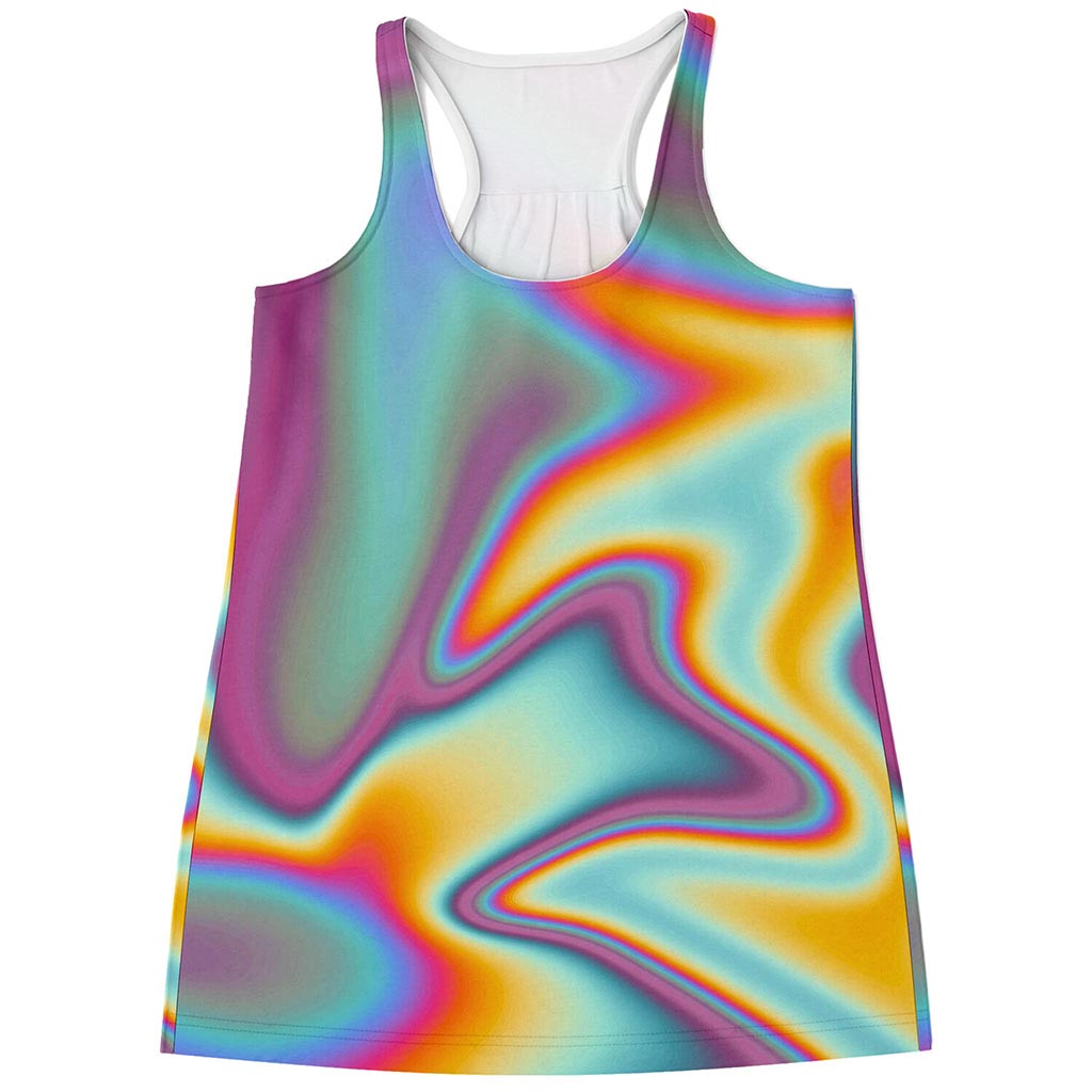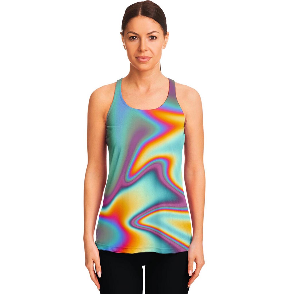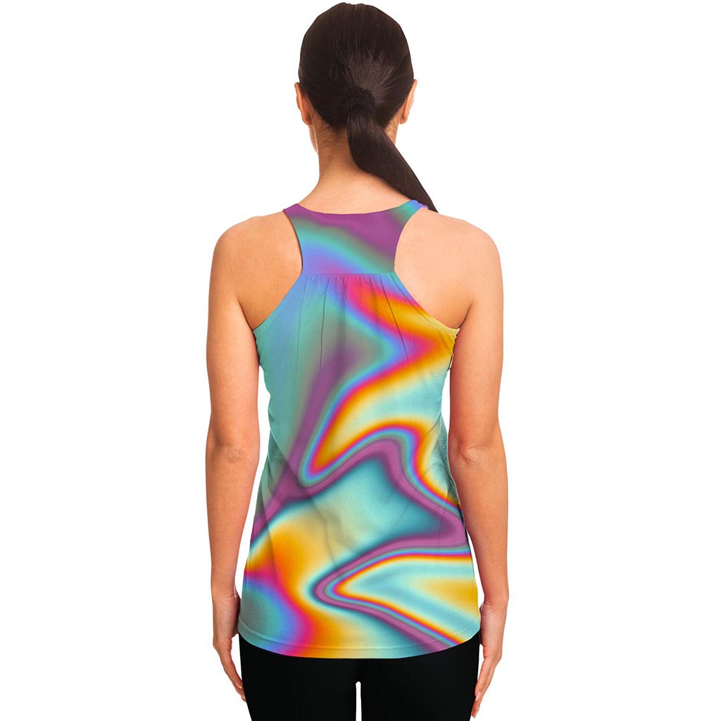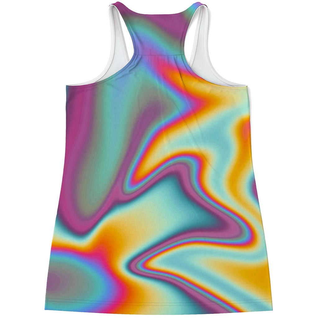 Stay cool and stylish with the versatile Liquid Holographic Trippy Print Women's Racerback Tank Top. Designed for women who prioritize comfort and functionality, this racerback tank top is the perfect addition to your active and casual wardrobe. Whether you’re working out, running errands, or relaxing at home, this tank top offers a sleek and flattering fit that keeps you looking great and feeling confident.