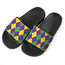 Are you looking for unique slides? Check our Mardi Gras Argyle Pattern Print Black Slide Sandals on GearFrost. Our slides are handcrafted to the highest quality standards and made-to-order for you!