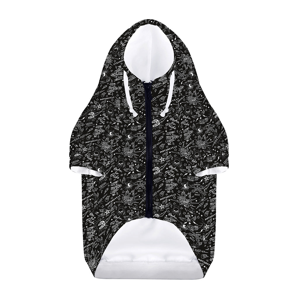 The Motorcycle Words Pattern Print Dog Zip Up Hoodie is more than just pet clothing—it’s a way to express your style while offering practical benefits. From lounging at home to neighborhood strolls, this hoodie provides an easy wardrobe addition for pets that don't mind dressing up.