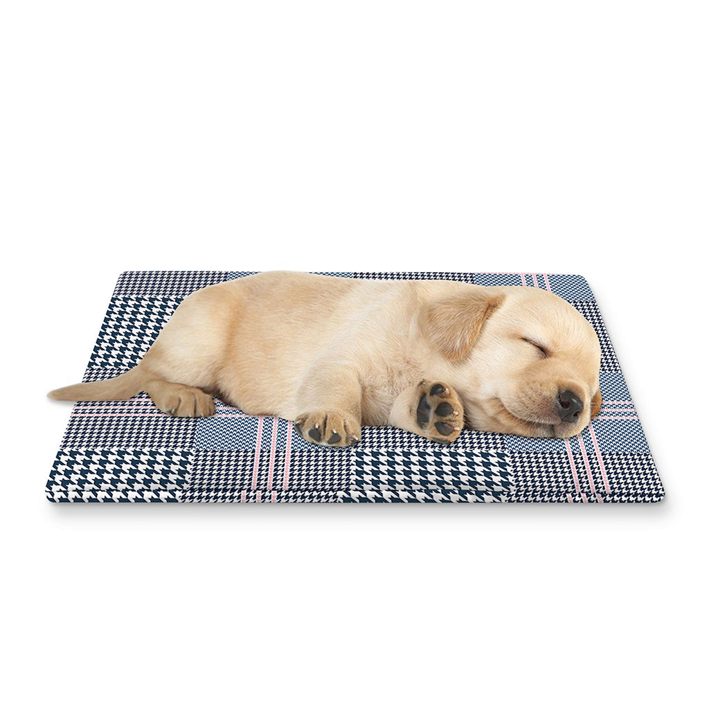The Navy And White Glen Plaid Print Pet Cooling Mat Cover is ideal for small to medium-sized pets such as cats and dogs. Whether placed in a crate, on the floor, or in your car, it adds comfort without requiring any complex setup. It's a practical choice for pet owners looking for something stylish, functional, and easy to maintain.