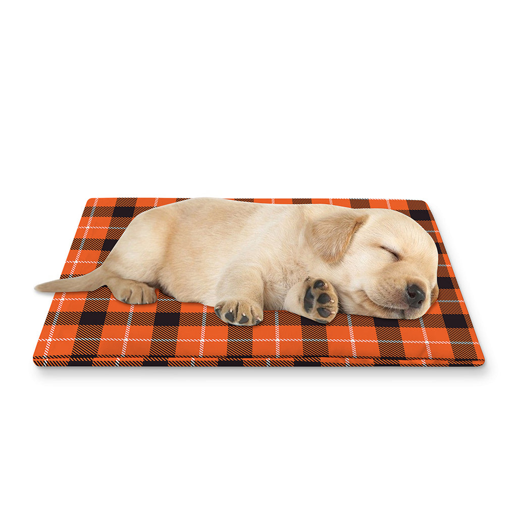 The Orange Grey And White Plaid Print Pet Cooling Mat Cover is ideal for small to medium-sized pets such as cats and dogs. Whether placed in a crate, on the floor, or in your car, it adds comfort without requiring any complex setup. It's a practical choice for pet owners looking for something stylish, functional, and easy to maintain.
