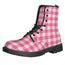 Step out with confidence in the Pink And White Buffalo Check Print Lace-Up Boots. Built with a 100% vegan PU leather upper and a durable rubber outsole, these lace-up boots balance everyday comfort with reliable traction—great for daily wear without overpromising performance.