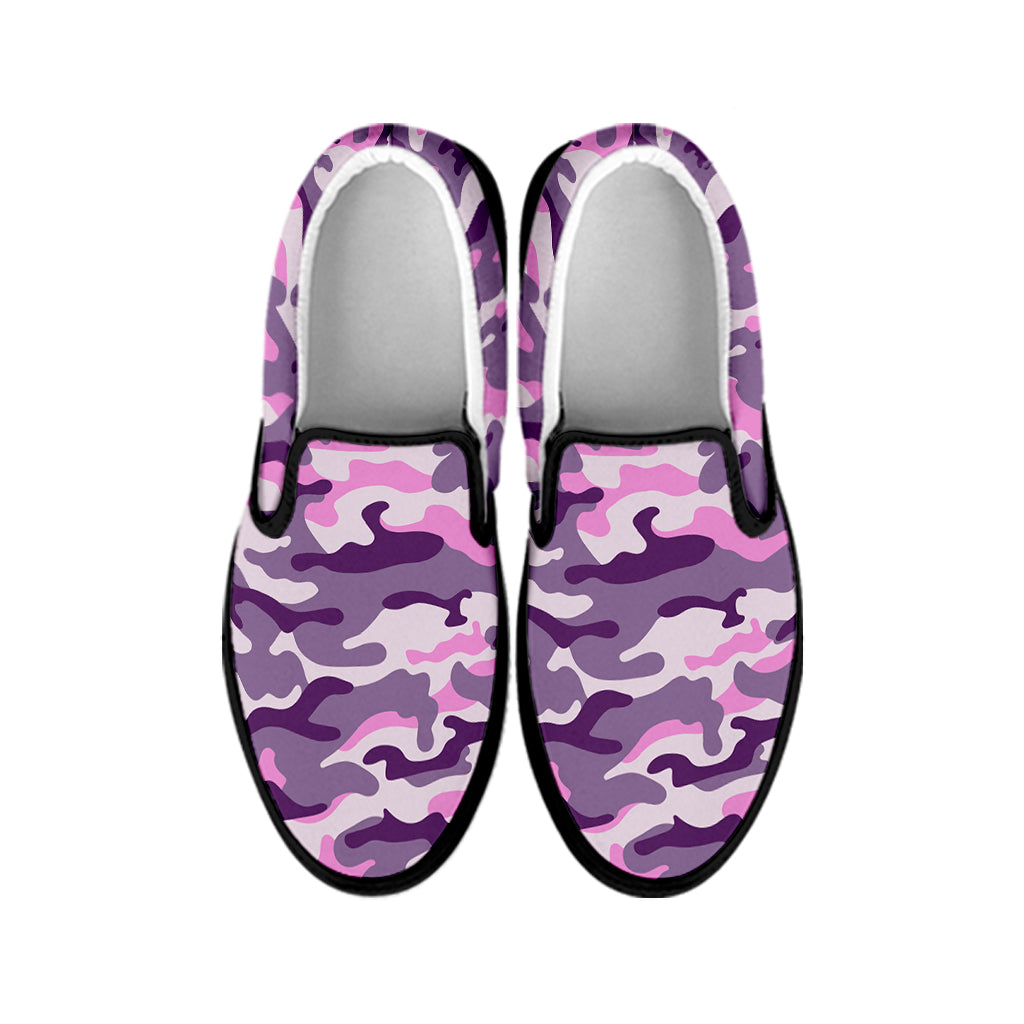 Are you looking for unique sneakers? Check our Pink Purple And Grey Camouflage Print Black Slip On Sneakers on GearFrost. Our sneakers are handcrafted to the highest quality standards and made-to-order for you!