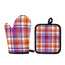 The Purple And Orange Madras Plaid Print Oven Mitt And Pot Holder Set is a reliable kitchen essential designed to keep your hands and surfaces safe during everyday cooking. Made from durable polyester with an insulation cotton lining, this set offers comfort and practical heat resistance for common kitchen tasks.