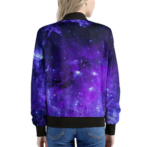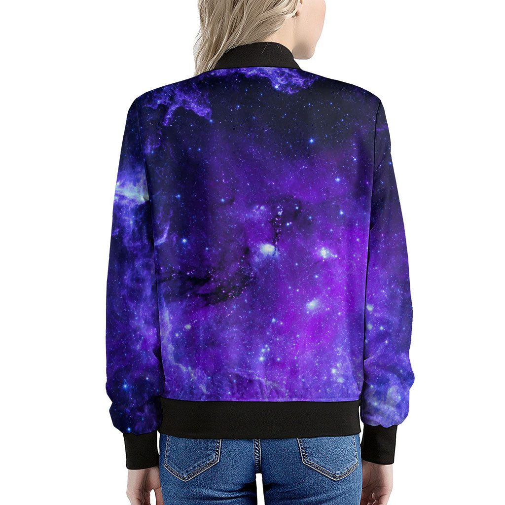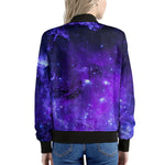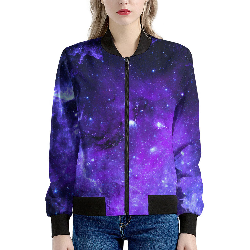 Make a bold statement with the sleek and stylish Purple Stars Nebula Galaxy Space Print Women's Bomber Jacket. This women's bomber jacket combines a classic silhouette with modern design, offering the perfect mix of fashion and functionality. Whether you're layering it for a chilly day or adding a finishing touch to your outfit, this jacket is designed to keep you comfortable while elevating your style.