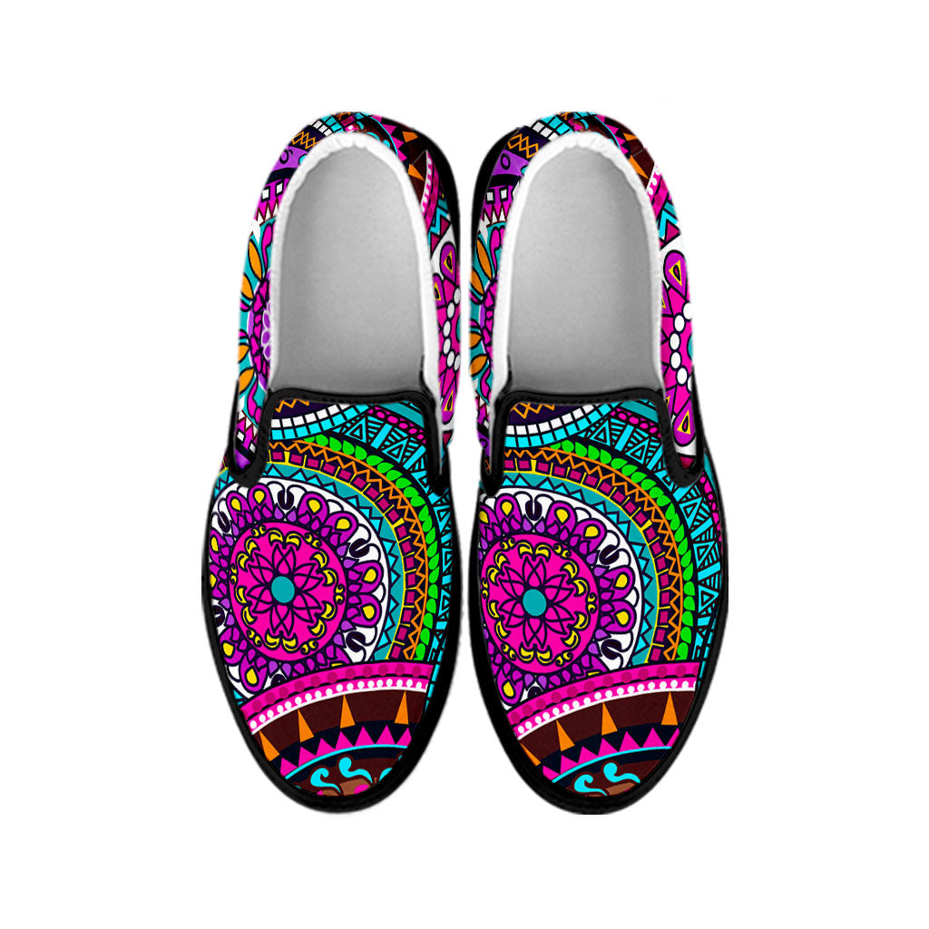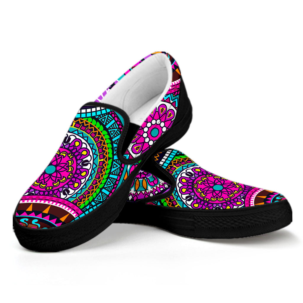 Are you looking for unique sneakers? Check our Purple Teal Circle Mandala Print Black Slip On Sneakers on GearFrost. Our sneakers are handcrafted to the highest quality standards and made-to-order for you!