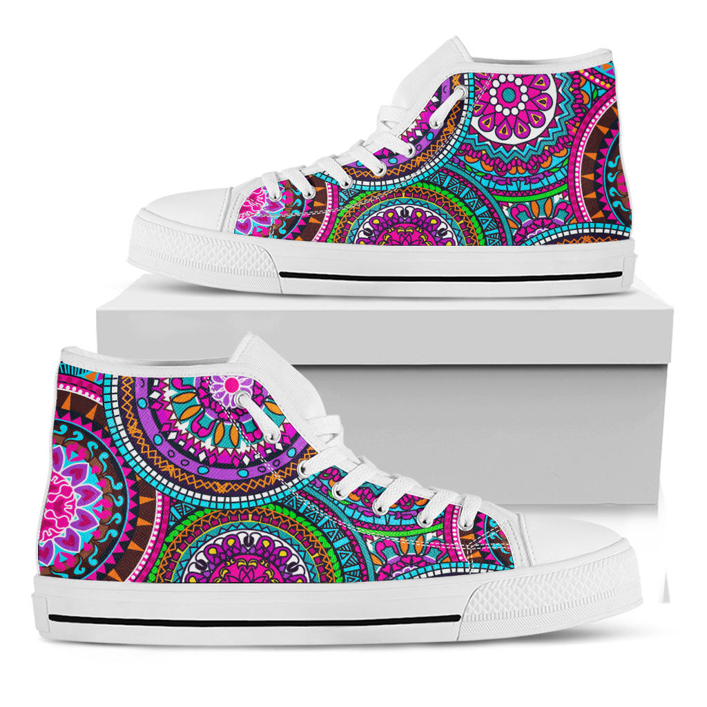 Are you looking for unique sneakers? Check our Purple Teal Circle Mandala Print White High Top Sneakers on GearFrost. Our sneakers are handcrafted to the highest quality standards and made-to-order for you!