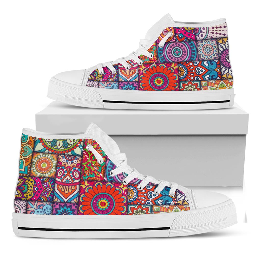 Are you looking for unique sneakers? Check our Square Bohemian Mandala Patchwork Print White High Top Sneakers on GearFrost. Our sneakers are handcrafted to the highest quality standards and made-to-order for you!