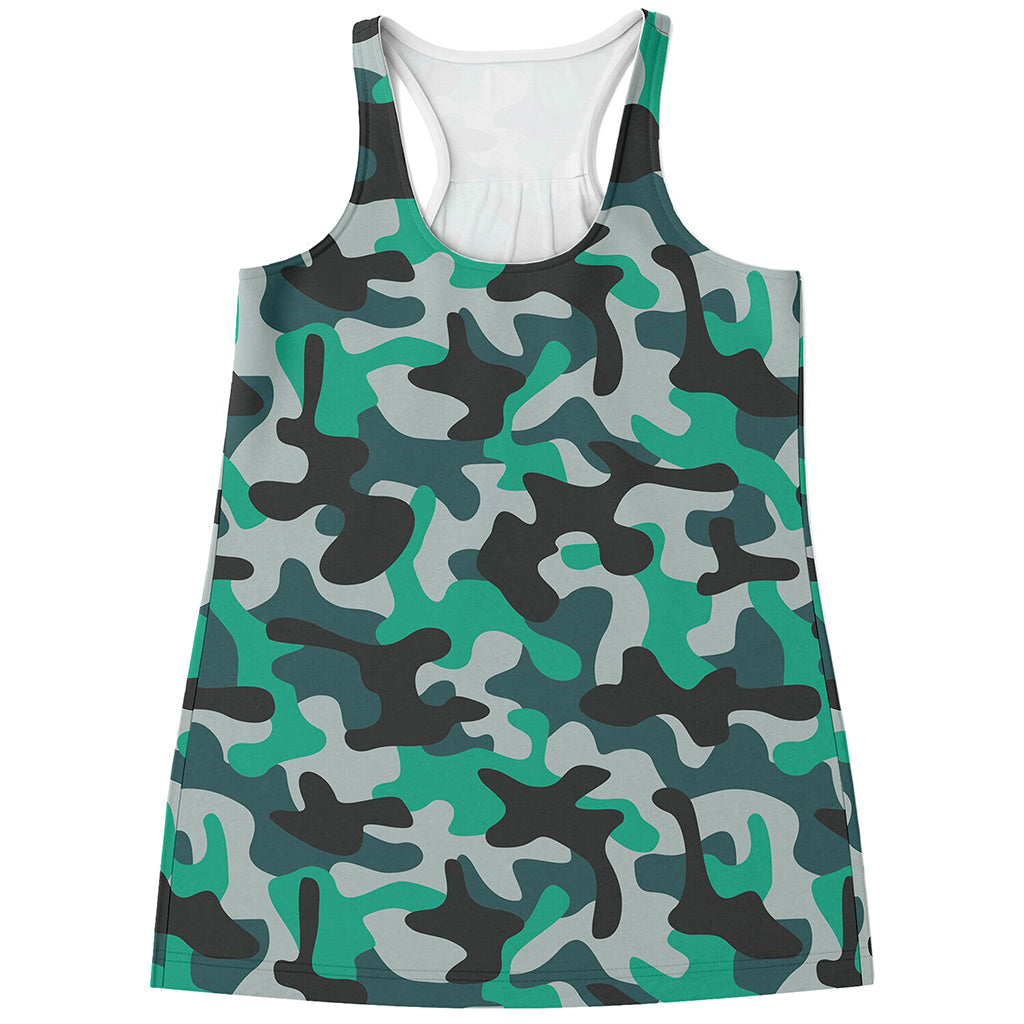 Stay cool and stylish with the versatile Teal And Black Camouflage Print Women's Racerback Tank Top. Designed for women who prioritize comfort and functionality, this racerback tank top is the perfect addition to your active and casual wardrobe. Whether you’re working out, running errands, or relaxing at home, this tank top offers a sleek and flattering fit that keeps you looking great and feeling confident.
