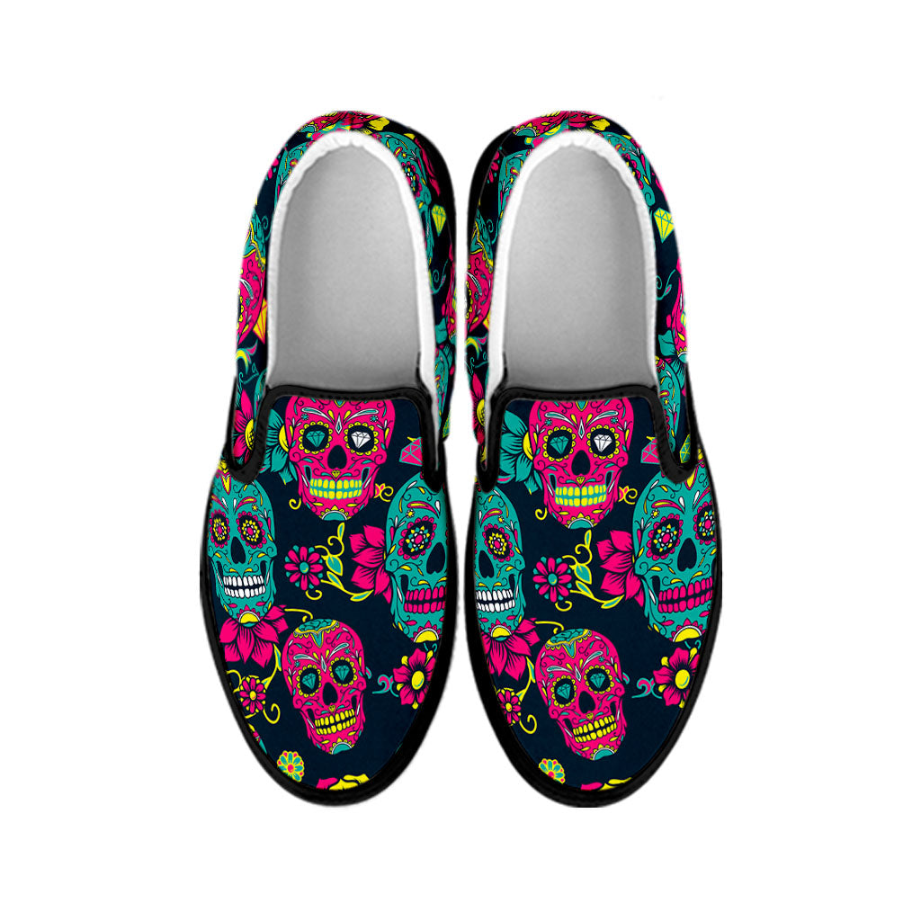 Are you looking for unique sneakers? Check our Teal Pink Sugar Skull Pattern Print Black Slip On Sneakers on GearFrost. Our sneakers are handcrafted to the highest quality standards and made-to-order for you!