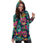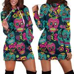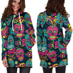 Teal Pink Sugar Skull Pattern Print Hoodie Dress GearFrost