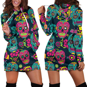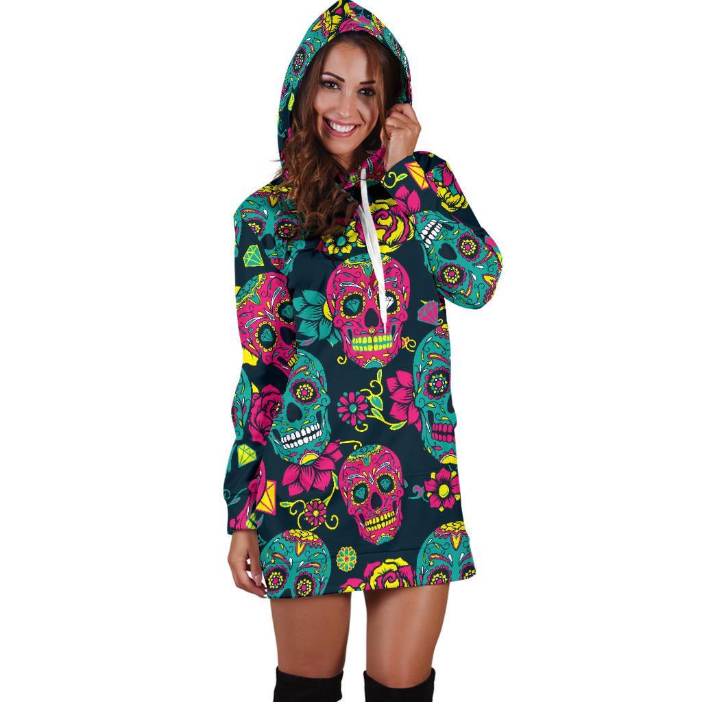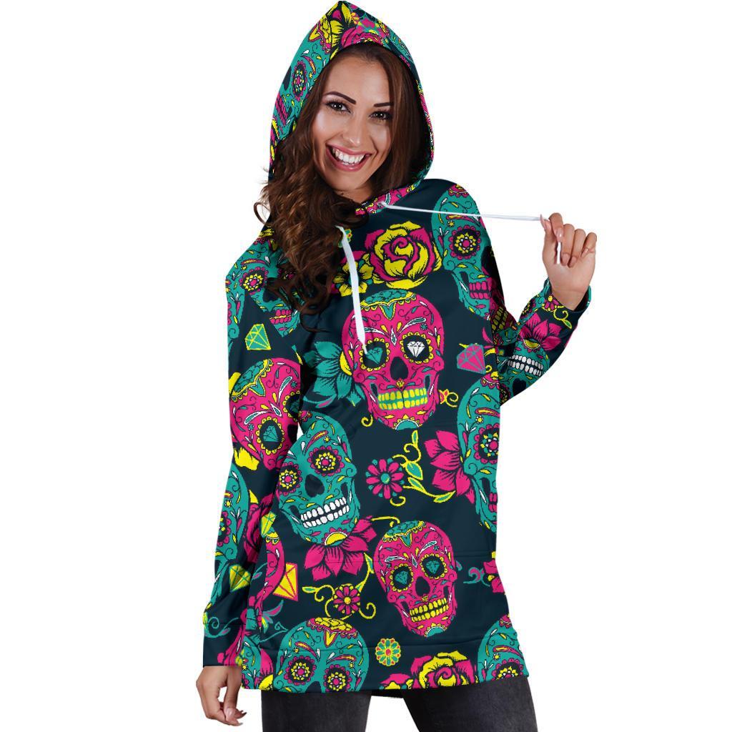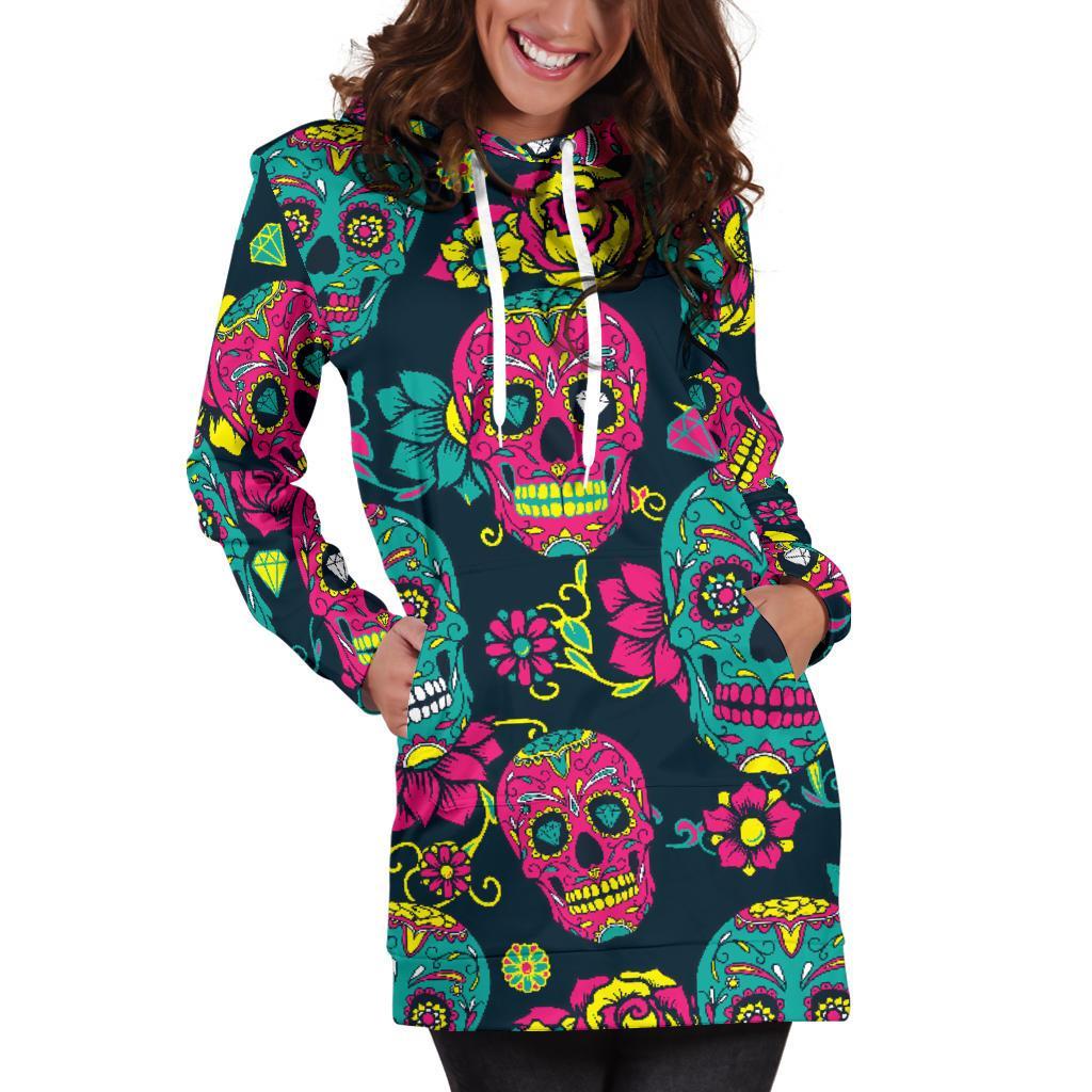 Are you looking for unique hoodie dresses? Check our Teal Pink Sugar Skull Pattern Print Pullover Hoodie Dress on GearFrost. Our hoodie dresses are handcrafted to the highest quality standards and made-to-order for you!