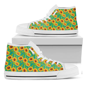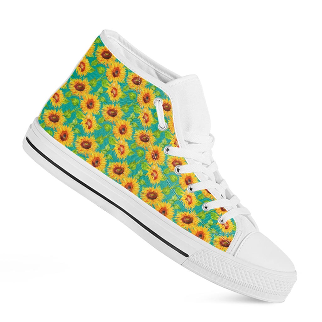 Are you looking for unique sneakers? Check our Teal Watercolor Sunflower Pattern Print White High Top Sneakers on GearFrost. Our sneakers are handcrafted to the highest quality standards and made-to-order for you!