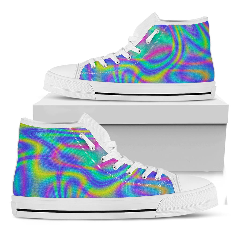 Are you looking for unique sneakers? Check our Turquoise Holographic Trippy Print White High Top Sneakers on GearFrost. Our sneakers are handcrafted to the highest quality standards and made-to-order for you!
